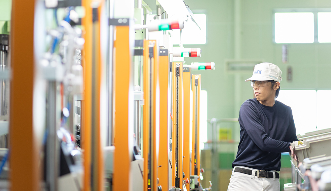 自動車部品を製造する100%OEM。品質や納期に応えるため、安定したモノづくりを行う浜田工業株式会社。職場は年齢、性別や経験に囚われない環境。無理なく無駄なく作業を行うため、社員の待遇や福利厚生を常に改善。高い生産性と確かな信頼は、快適な職場で働く社員一人一人が培ってきたものなのだろう。
