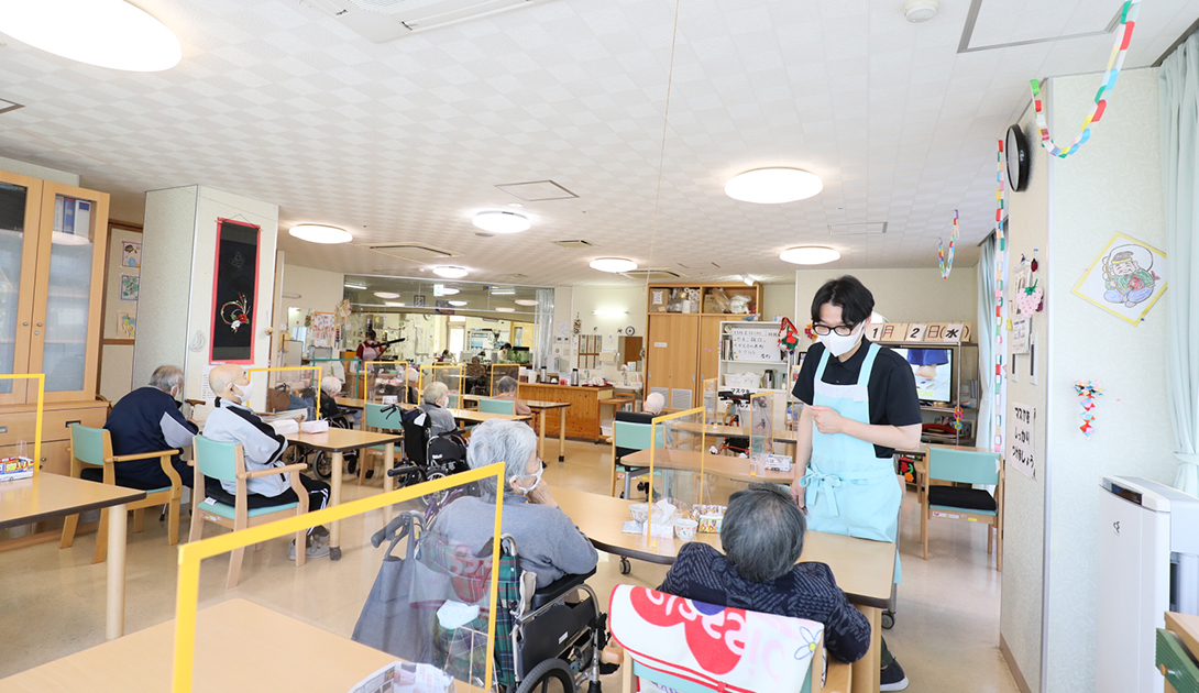 特別養護老人ホーム「たんぽぽの里」の基本理念は「共に生きる」。高齢者と介護者は人と人、つまり心と心が向き合うことが大切。一人一人の職員が「人の気持ち」を持ちながら関わり、それが浜田市の高齢者の、心と体の支えになっている。また特養では最期の看取りまで、心を込めて対応。介護士、介護補助員、生活相談員、ケアマネなどチーム一丸となって高齢者とその家族を支えている。