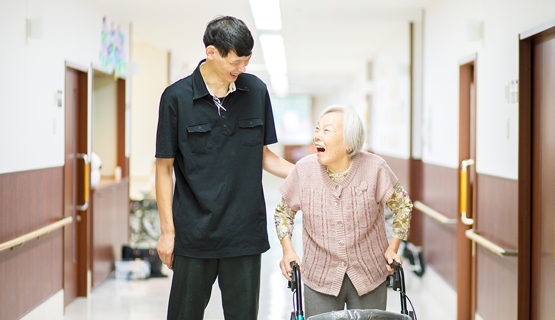 以前は異業種で働いていたが、知人を介して「介護」の世界を知った。そこで教育体制が整い、学びながら働ける環境に魅力を感じて「水澄み会」の職員になった佐々木さん。自分の身の回りのことができる人とそうでない人。認知症の症状のある人とない人。生活のリズムが整っている人とそうでない人。佐々木さんは個々によって違う身体状況を見極めながら高齢者のサポートを行なっている。勤務は早番、日勤、遅番、夜勤のサイクルだ。「不規則ですし、大変といえば大変なのですが、それ以上に学ぶことや嬉しいことも多いんですよ」と笑顔。入浴や食事、トイレなど介助の中で「いつもありがとうね」というお客様からの笑顔やちょっとしたひと言で、疲れも吹き飛ぶのだという。