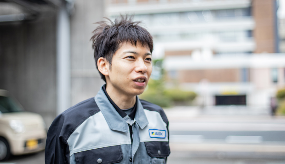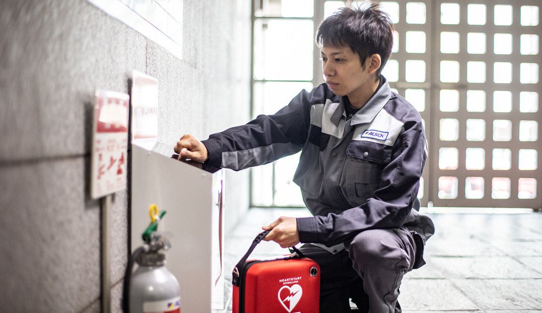 心配蘇生装置AEDの管理・運営、消防設備の維持管理など、人々の命に直接関わる設備を取り扱う。そのためには正確で誠実な対応と、確かな人間力が必要だ。「浜田の貢献できる仕事を」と志して取り組むこの仕事に、やりがいと誇りを感じ、さらに成長している。