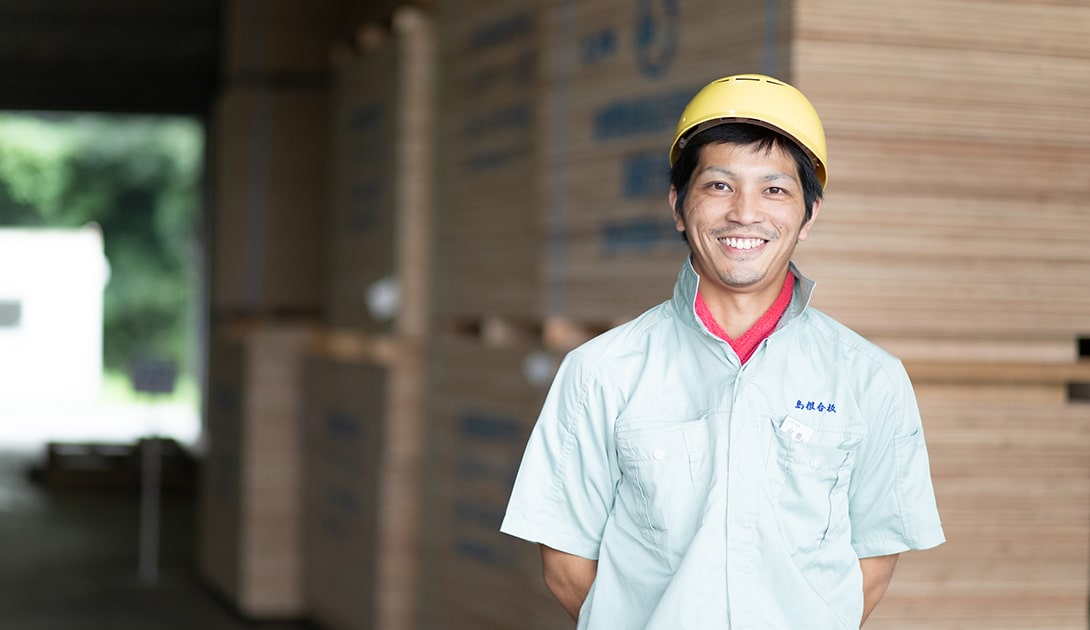 高校卒業後、森林資源から住宅建材資材を作る事業モデルに興味を持ったこと、そして地元の浜田で仕事がしたくて、高校推薦で島根合板に入社。プライベートでは3児の父。公私ともに充実している。