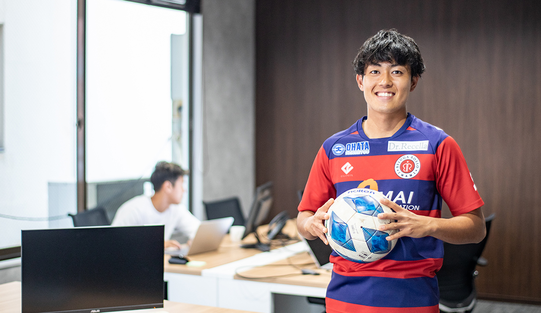 出社は3時間の練習の後とあって、なかなかのハードワークだ。曽根さんのポジションはミッドフィルダー(MF)。フォワード(FW)のゴールのために的確なパスを出し、ディフェンダー(DF)の守備的なサポートもしていくオールラウンドプレイヤー。チームの状況判断が必要なこのポジションは、きっと社会でも活躍できる人材なのだろう。