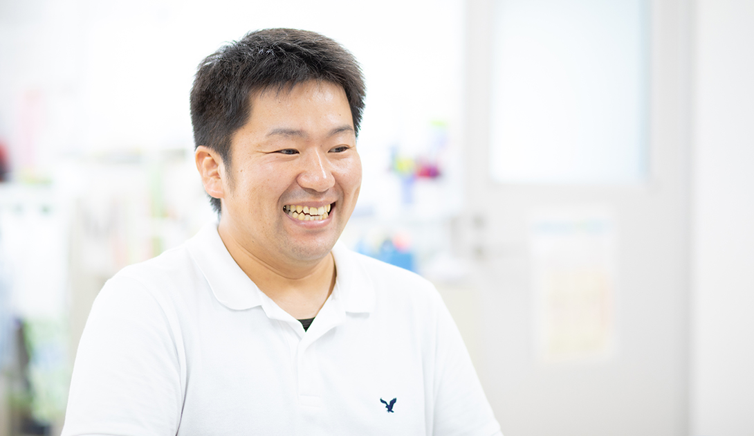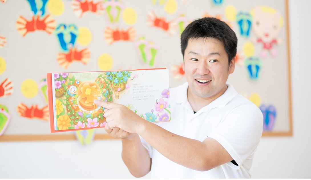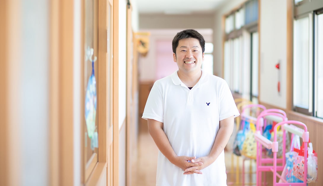 上府保育園において15名いる年中クラスの担任。このほか、男性保育士として運動教室や4、5歳児にサッカー、器械体操、水泳など、得意の運動系の指導をしている。この保育園で2人所属する男性保育士のうちの1人が森岡さん。子どもたちにとって兄であり父のような無二の存在でありたいと願い、日々の保育に取り組む。