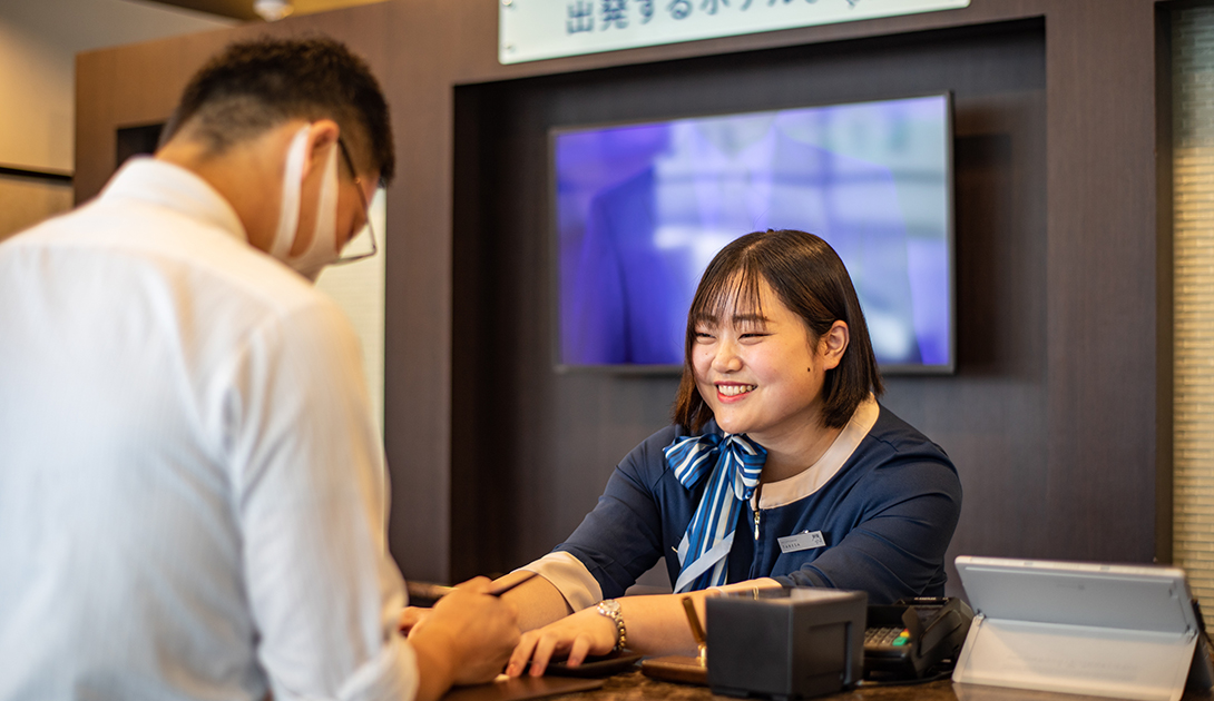 東横INN浜田駅北口に勤務して約2年。前職の事務職からホテル業務への転身だった。「人と接することが好き」と顔を輝かせる。ビジネスや観光で、非日常を過ごす宿泊客にとって、その笑顔は癒しの対象になっている。