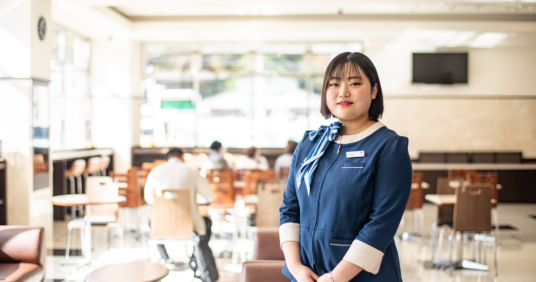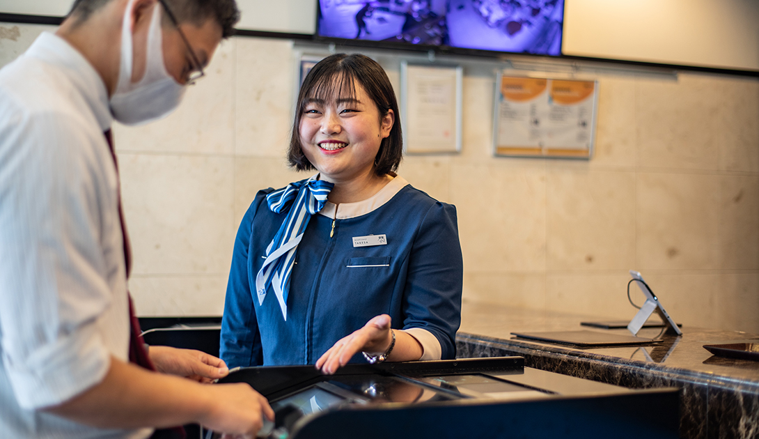 チェックイン、チェックアウト。そして宿泊客の困りごとの対応や清掃管理、電話対応。ホテルの顔としてフロント業務を勤める竹佐さん。中途採用でこの仕事に就き約2年。「たいへんだけど、思ってたより面白い!」と仕事の醍醐味を笑顔で話す。