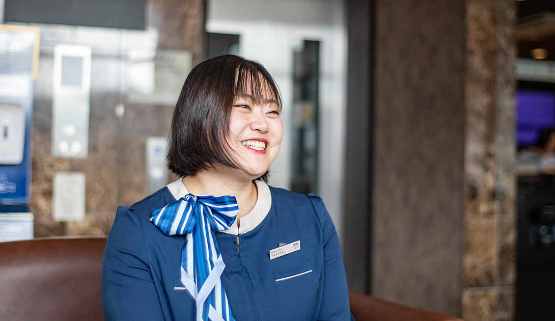 勤務は仮眠・休憩を含めて1日25時間。その代わり次の2日間はお休み。オンとオフを見事に切り替えながら頑張っている。「体力的には大変な時もありますが、お客様の『ありがとう』という言葉が何よりも嬉しくて」と竹佐さん。「困りごとのあったお客様がチェックアウトされる際、『あなたの対応がすごく嬉しかった。ありがとう』『あなたがいるから、またこのホテルに泊まろうと思ったのよ』とか、わざわざ声をかけてくださる方もおられて。お客様アンケートではなく、面と向かって言ってくださるのが嬉しくて」と素敵な笑顔。決して事務作業では得られない喜びのようだ。時々、広島などにヘルプで行くこともあり、「たまに行く広島にはテンションが上がりますね」とまた笑顔で話していた。