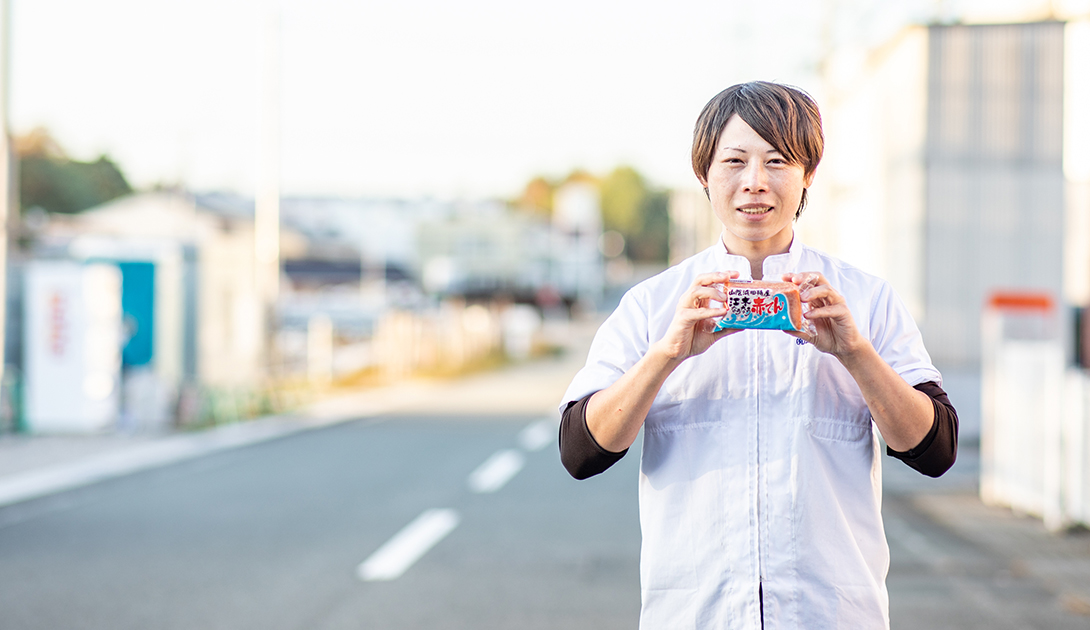 赤てんをはじめ、練り物製品の包装、製造ラインの管理監督に従事、効率のいい速やかな製造ラインを構築している。現場で一緒に働く人たちの声を汲み上げ、それを業務に反映していくことをモットーにしているという、やさしさと責任感を併せ持つ人物だ。物を作る現場が自分に合っていると感じ、日々充実感を持っている。