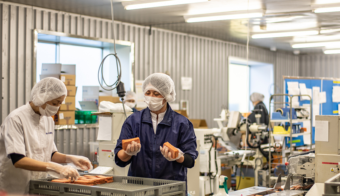 包装部署で管理監督、そして生産計画や他署との連携、それに事務作業などを担い、その活躍の場は幅広い。一度は広島の企業に勤めたがUターンし、以前に勤務していた江木蒲鉾店に再就職した。即戦力となるキャリアを活かして会社の大きな力になっている。もともと物作りや製造業が好きで、自分に合っているという隘田さん。新工場での稼働が始まったばかりで多忙を極めているが「忙しい方が好きなんです」と笑顔を見せる。「忙しい時の方が頭がよく回り、先々の作業行程や課題などがよく見えてくるから充実感があるんです」と話す。「新しい体制が始まった今だから製造ラインをきちんと構築しておかないと。そのためにスタッフとミーティングを重ねて様々なことを決めるようにしています」と強い責任を感じている。社内の製造に係る取り決めやルールは、トップダウンではなくみんなの意見を聞きながらまとめていくことが自分の仕事であると話す隘田さんは、現場の理想的な上司と言える。話し合い、効率よく、そして社内の雰囲気も良い状態であれば業務に良い成果が出る。そしてまた新たな課題に取り組む…。そのおかげで江木蒲鉾店は発展していくだろう。