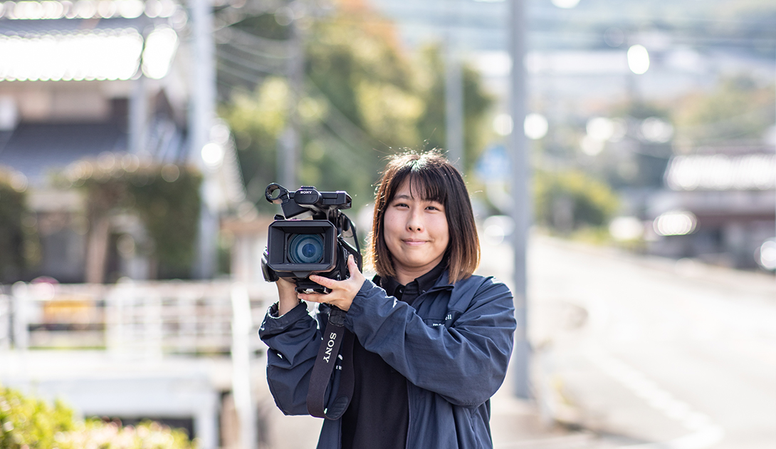 地元のイベントやインタビューなどの取材にカメラを持って出かけて撮影。取材対象者から話を聞き、帰社後には原稿作成や映像編集作業もこなす大変な仕事。しかし一人でこなすことの自由度と責任のある仕事にやりがいを感じている。取材を通して地元の人や風景に触れることができることも喜びのひとつだ。