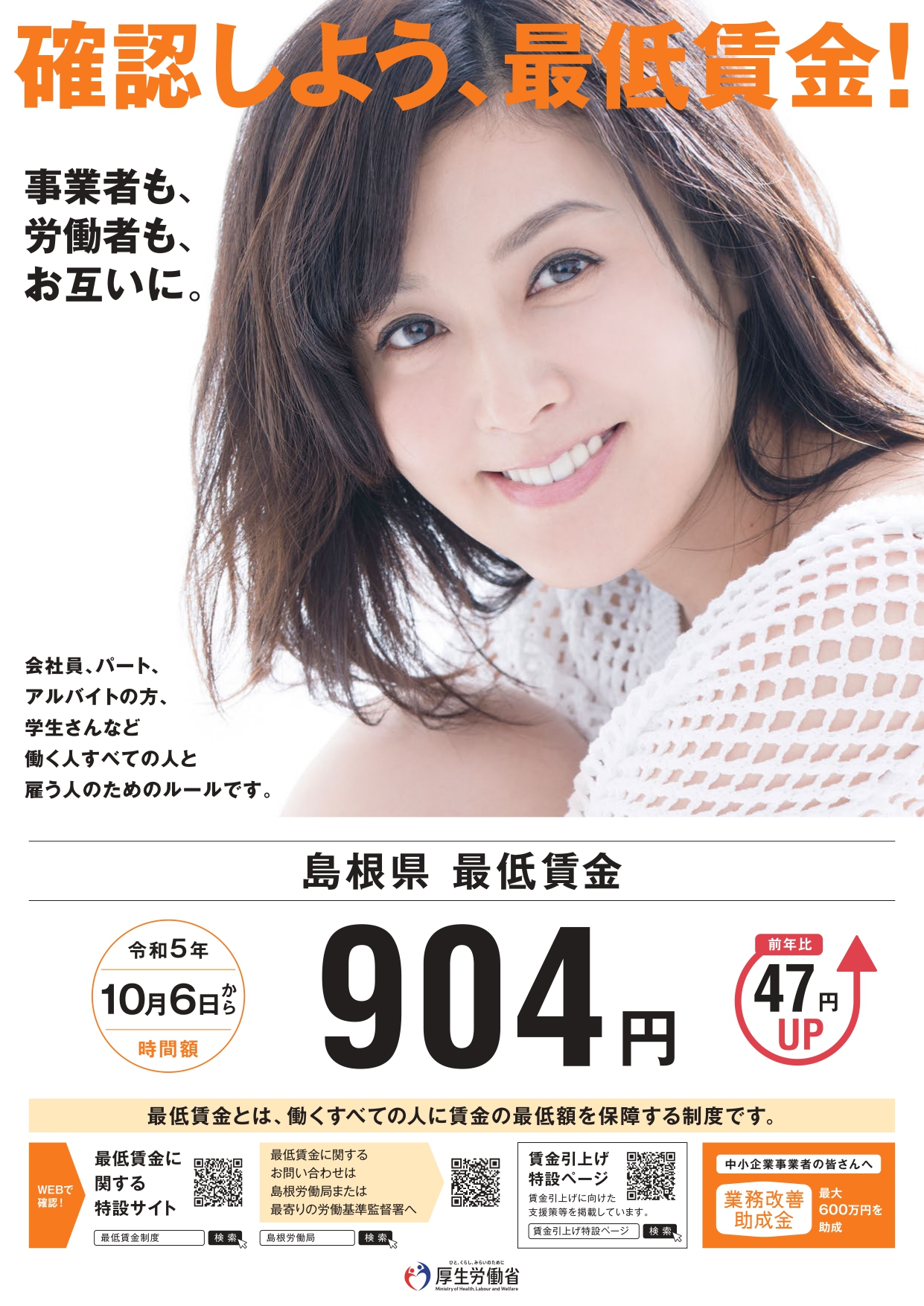 ※ 島根県労働局雇用環境・均等室(TEL0852-20-7007)では、労働者の賃金引上げを図る事業主を支援するため「業務改善助成金」を取り扱っています。詳しくは、お問い合わせください。